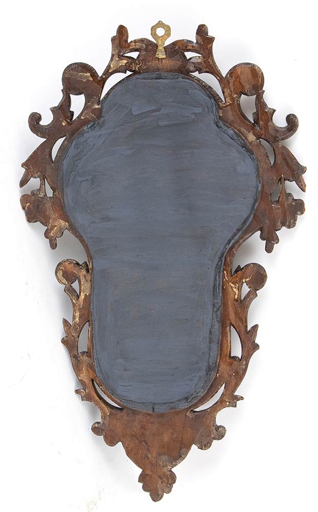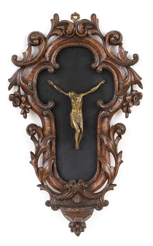 Crocifisso in bronzo dorato applicato su lastra di ardesia entro cornice barocca a volute di legno del XVIII secolo, cm. 57x34x8 (cornice); 17x14x4 (Crocifisso)