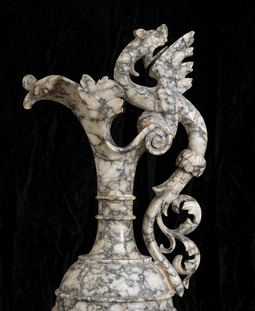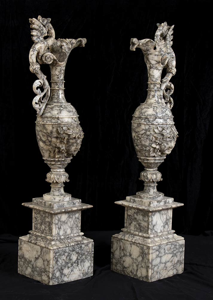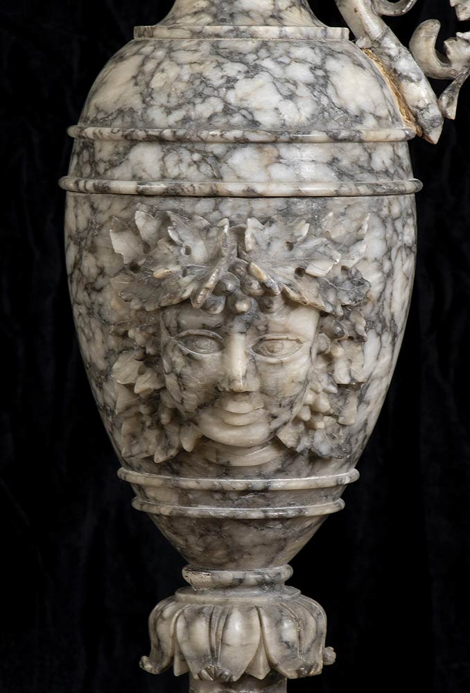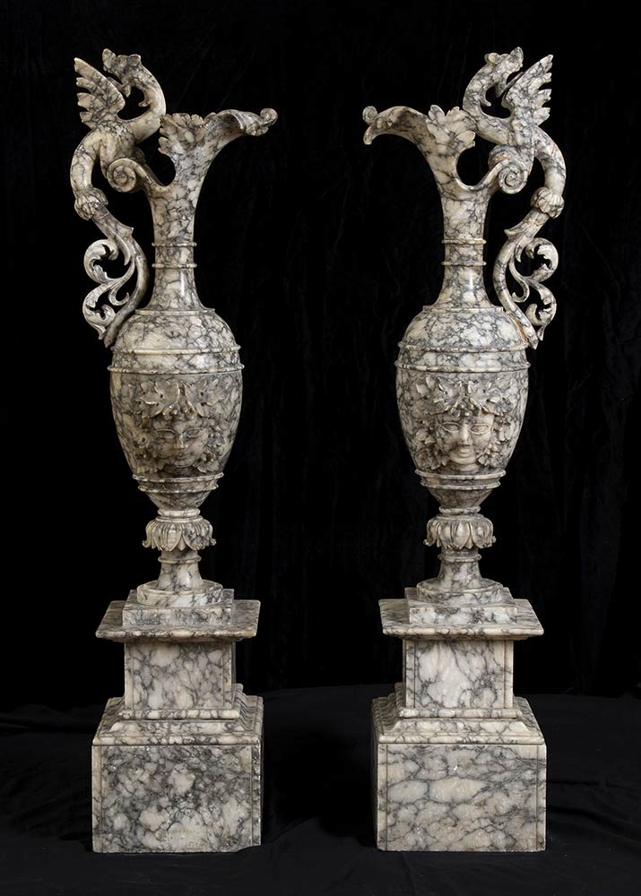 Coppia di vasi in alabastro con mascheroni a rilievo e anse zoomorfe