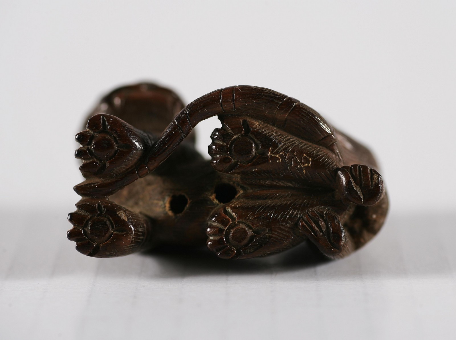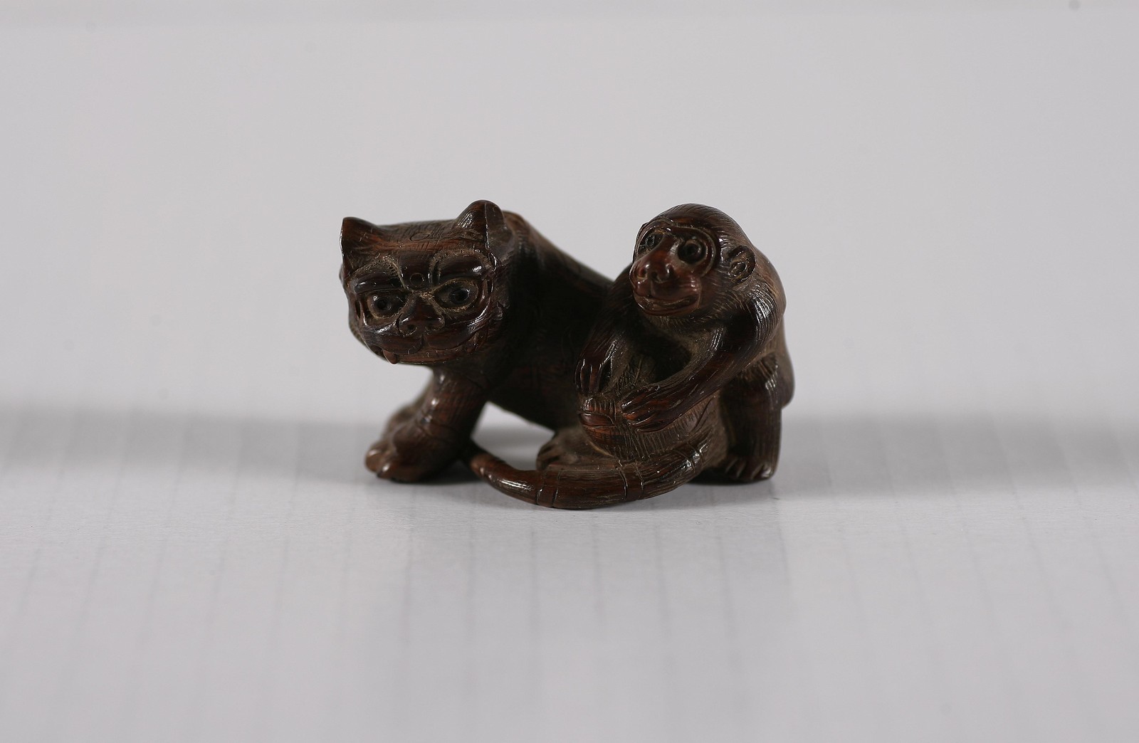 MANIFATTURA GIAPPONESE DEL XIX SECOLO Netsuké raffigurante una tigre ed una scimmia. Legno scolpito. Cm 5,00 x 3,00 x 3,00.