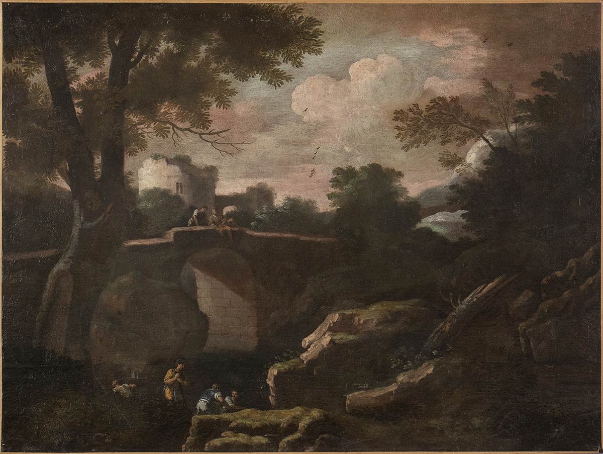 Paesaggio con ponte, tomba di Cecilia Metella e figure
