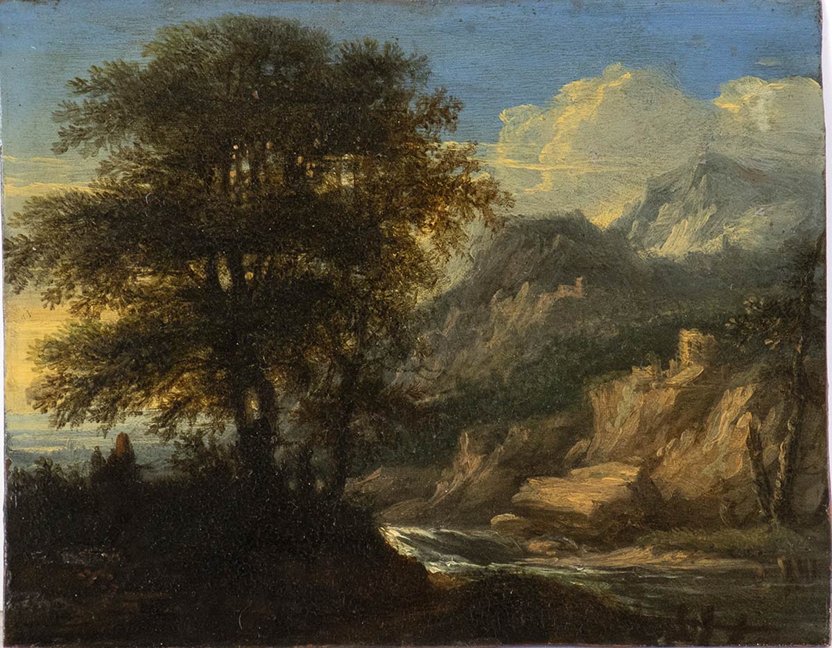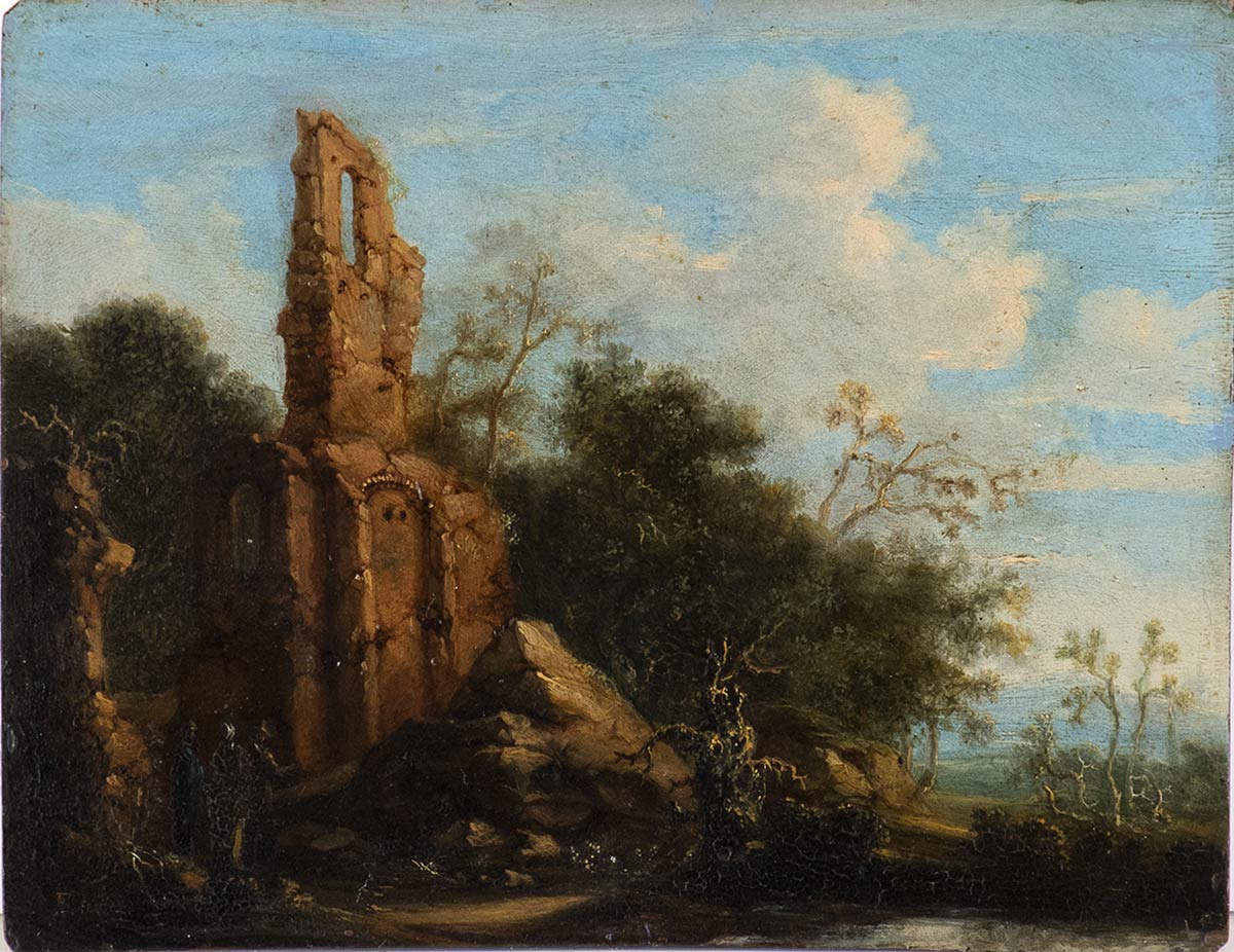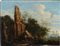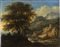 Paesaggio con corso d'acqua e montagne - Paesaggio con ruderi e figure. Coppia di dipinti