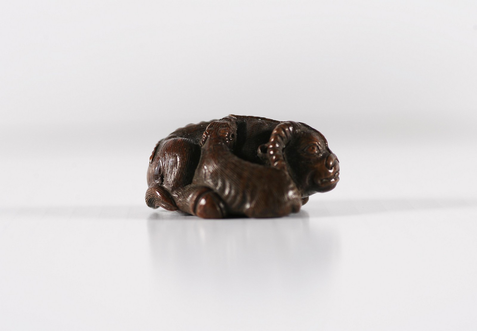 MANIFATTURA GIAPPONESE DEL XIX SECOLO Netsuké raffigurante una bufala ed il suo piccolo. Legno scolpito. Cm 3,00 x 2,00 x 4,00.