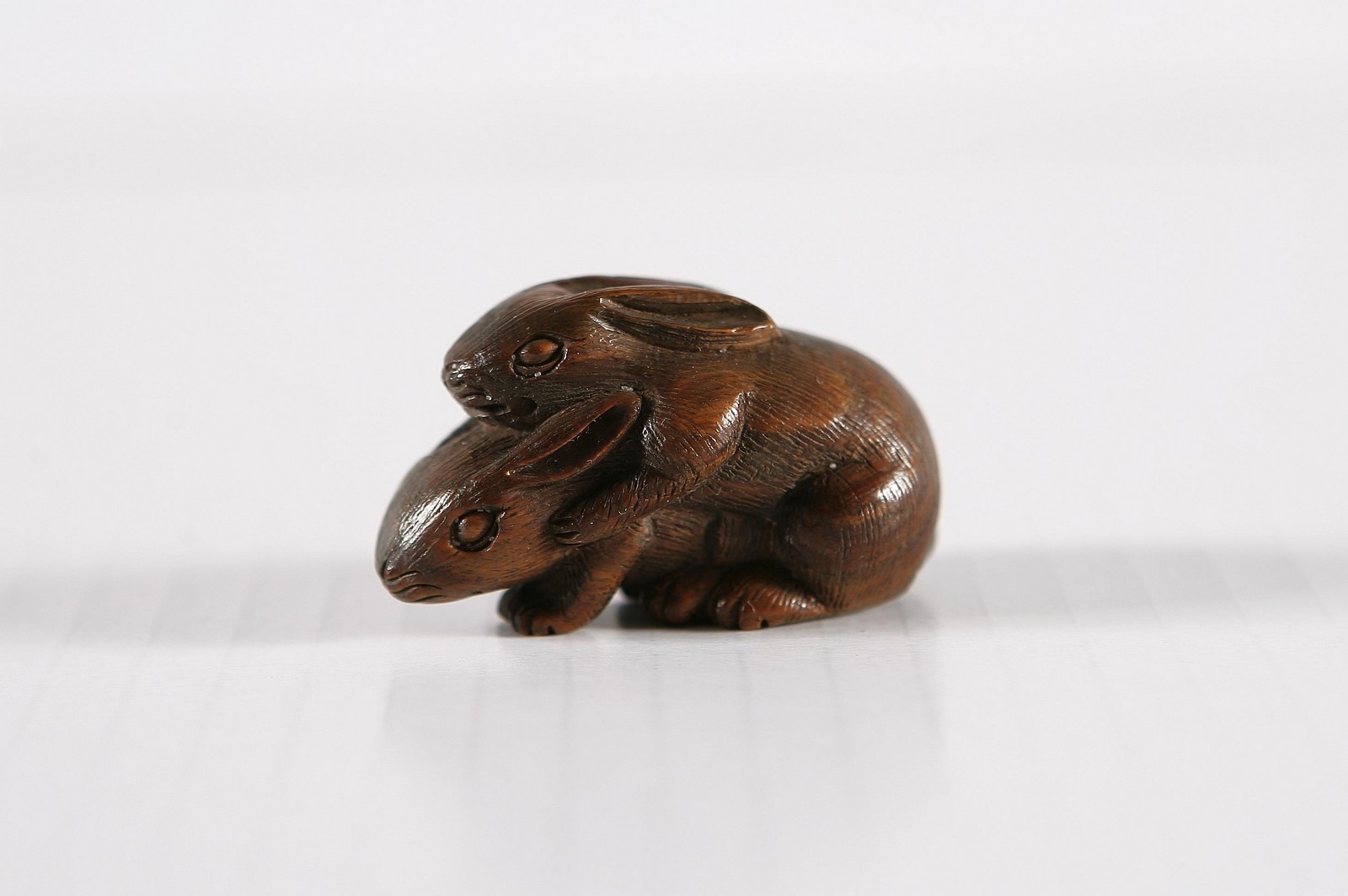 MANIFATTURA GIAPPONESE DEL XIX SECOLO Netsuké raffigurante due conigli. Legno scolpito. Cm 5,00 x 3,00 x 2,50.