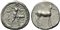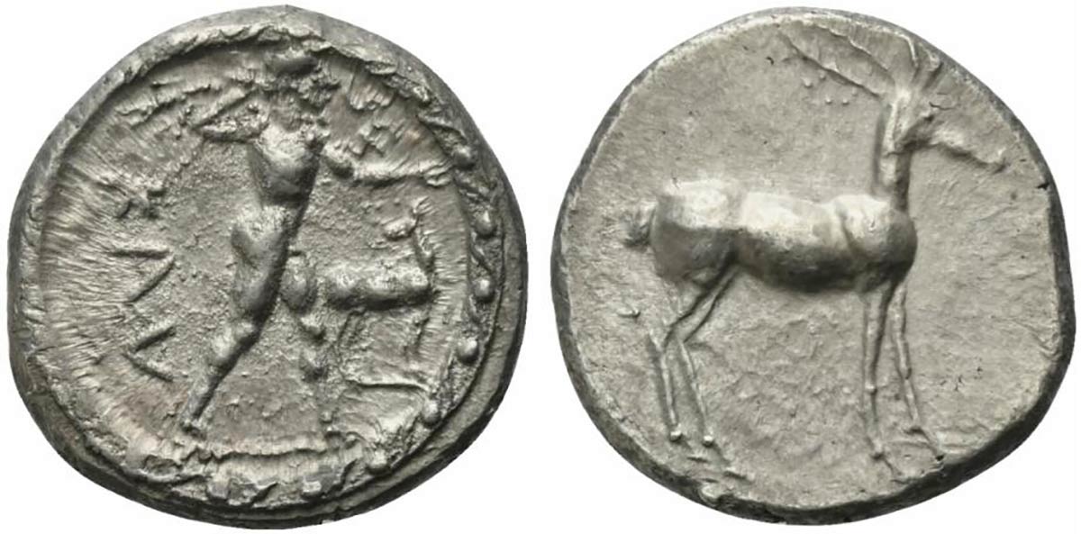 Bruttium, Caulonia, Stater, ca. 475-425 BC; AR (g 8,05; mm 22; h 12); KAV, Apollo naked, advancing r., holding a branch in uplifted r. hand and a small naked running figure or daimon on outstretched l. arm; on r., stag standing r. and looking backwards, Rv. Stag standing r. HNItaly 2044.