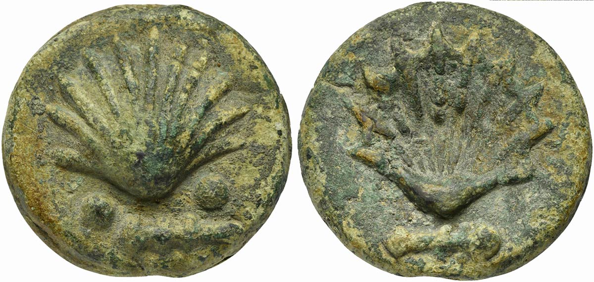 Roman Republic, Club symbol series, Cast Sextans, Rome, ca. 235 BC; AE (g 51; mm 36; h 12); Scallop-shell seen from outside; below, club and ° °, Rv. Scallop-shell seen from inside; below, club. Crawford 27/9; ICC 62.