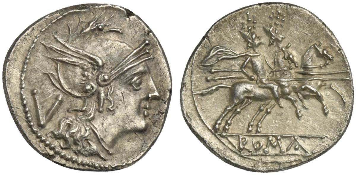 Anonymous, Quinarius, Rome, ca. 211-208 BC; AR (g 2,25; mm 15; h 11); Helmeted head of Roma r.; behind, V, Rv. Dioscuri galloping r.; in ex. ROMA. Crawford 47/1a; Sydenham 141.