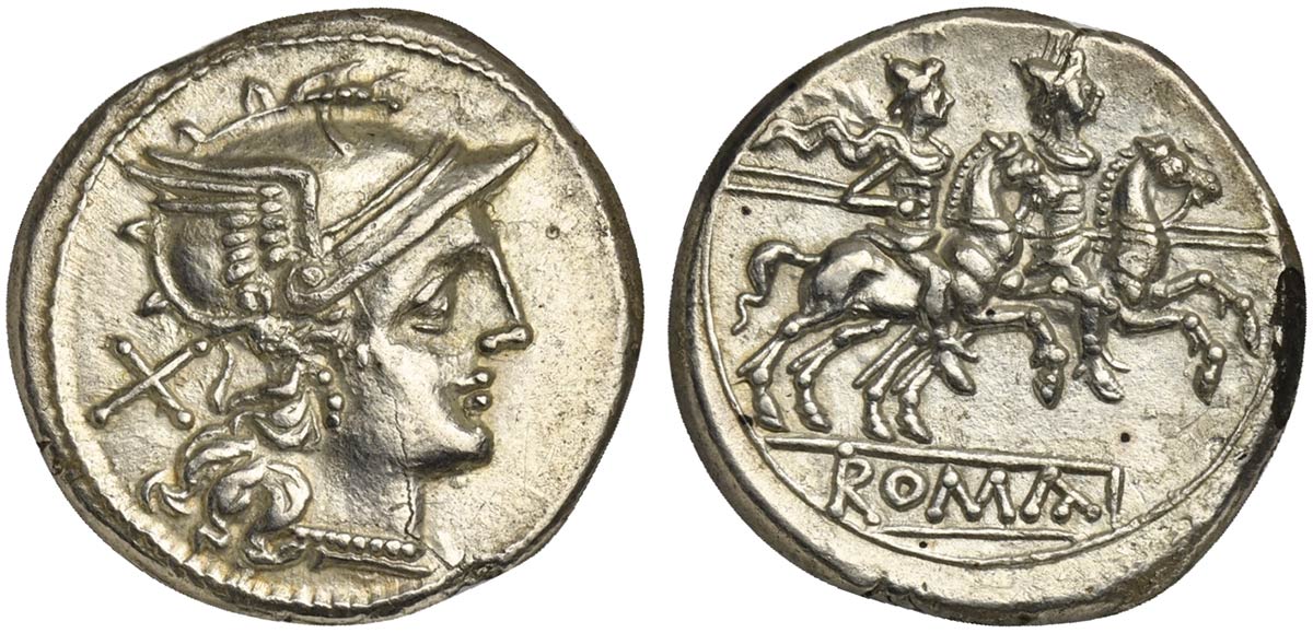 Lot 225 | Anonymous, Denarius, Rome, ca. 189-180 BC; AR (g 3,98; mm 18; h 7); Helmeted...