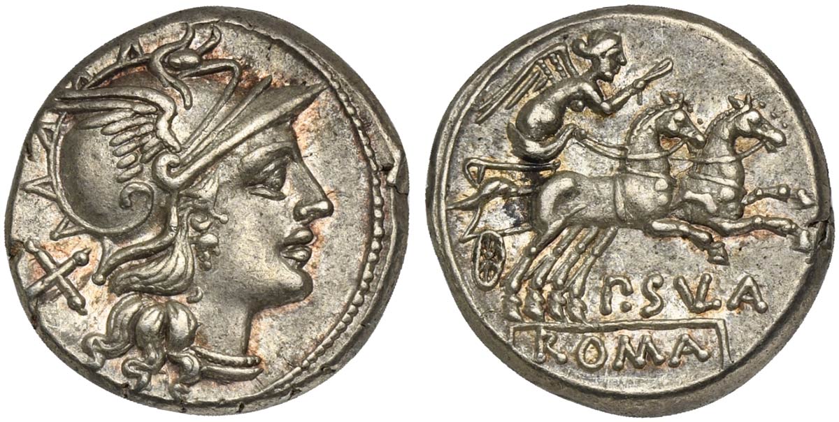 P. Cornelius Sulla, Denarius, Rome, 151 BC; AR (g 4,08; mm 18; h 6); Helmeted head of Roma r.; behind, X, Rv. Victory in biga r., holding reins and whip; below, P SVLA; in ex. ROMA. Crawford 205/1; Cornelia 1; Sydenham 386.