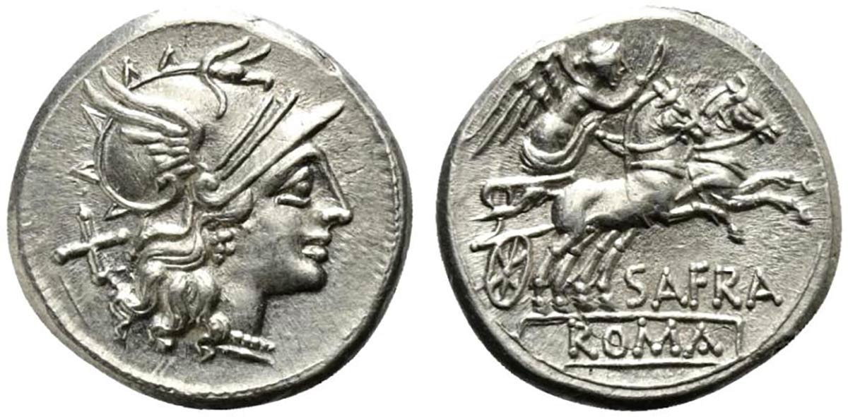 Spurius Afranius, Denarius, Rome, 150 BC; AR (g 4,07; mm 19; h 12); Helmeted head of Roma r.; behind, X, Rv. Victory in biga r., holding whip and reins; below, S AFRA; in ex. ROMA. Crawford 206/1; Afrania 1; Sydenham 388.