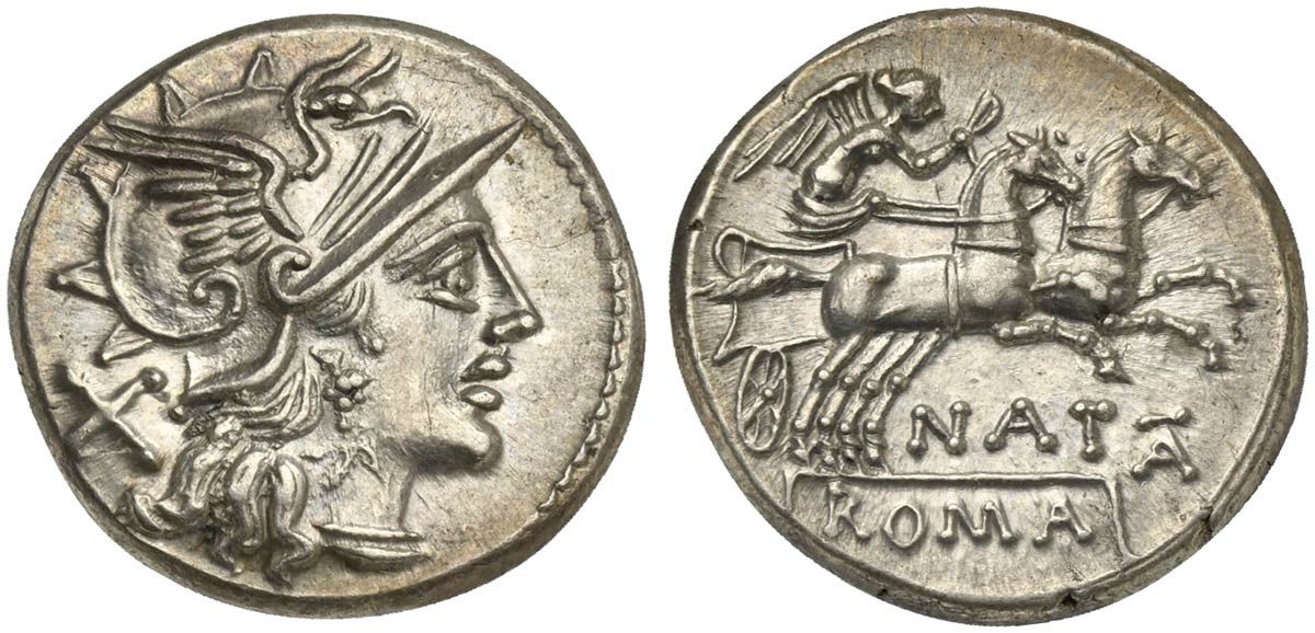Pinarius Natta, Denarius, Rome, 149 BC; AR (g 3,94; mm 18; h 5); Helmeted head of Roma r.; behind, X, Rv. Victory in biga r., holding reins and whip; below, NATTA; in ex. ROMA. Crawford 208/1; Pinaria 1; Sydenham 390.