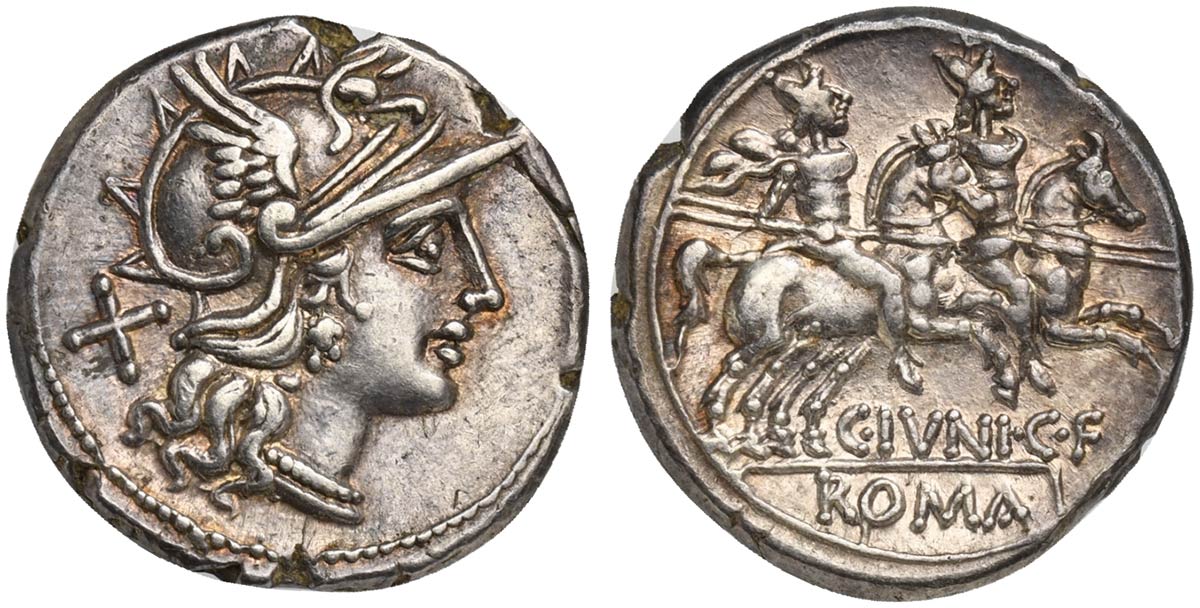 Lot 243 | C. Junius C.f., Denarius, Rome, 149 BC; AR (g 3,97; mm 18; h 1); Helmeted...