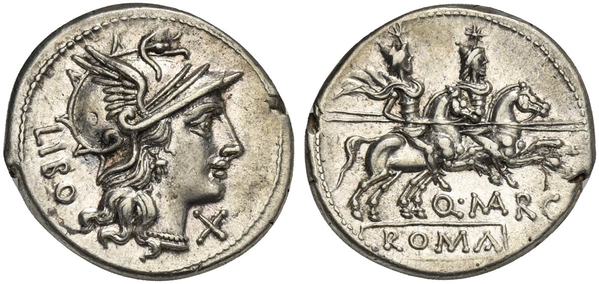 Q. Marcius Libo, Denarius, Rome, 148 BC; AR (g 3,82; mm 19; h 12); Helmeted head of Roma r.; behind, LIBO; before, X, Rv. Dioscuri galloping r.; below, Q MARC; in ex. ROMA. Crawford 215/1; Marcia 1; Sydenham 396.