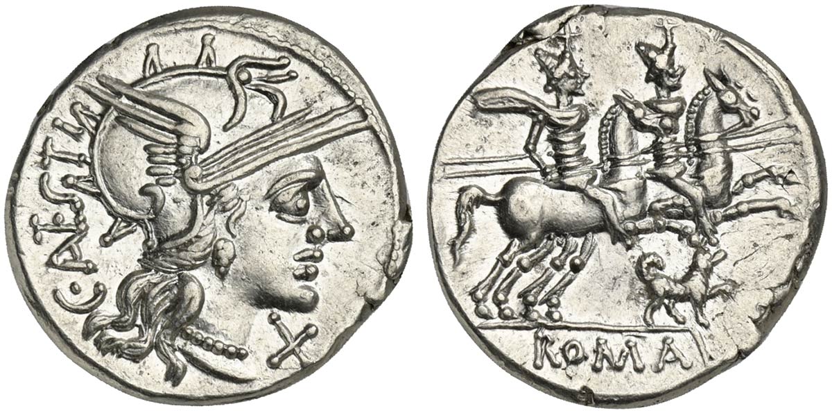 C. Antestius, Denarius, Rome, 146 BC; AR (g 3,65; mm 19; h 10); Helmeted head of Roma r.; before, X; behind, C ANTESTI, Rv. Dioscuri galloping r.; below, dog r. with one fore-feet raised; in ex. ROMA. Crawford 219/1d; Antestia 1; Sydenham 411.
