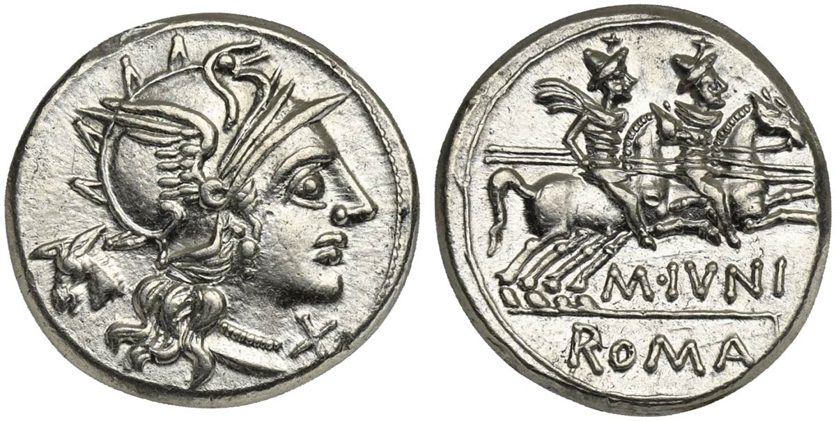 M. Junius Silanus, Denarius, Rome, 145 BC; AR (g 4,15; mm 19; h 3); Helmeted head of Roma r.; before, X; behind, ass head, Rv. Dioscuri galloping r.; below, M IVNI; in ex. ROMA. Crawford 220/1; Junia 8; Sydenham 408.