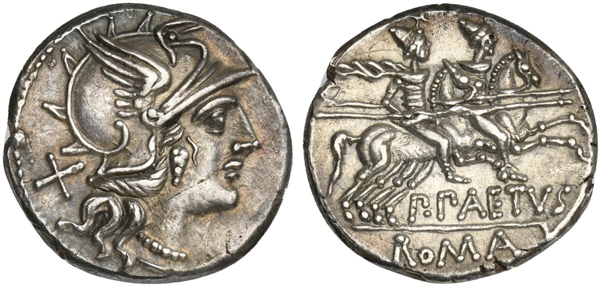 P. Aelius Paetus, Denarius, Rome, 138 BC; AR (g 3,78; mm 19; h 5); Helmeted head of Roma r.; behind, X, Rv. Dioscuri galloping r.; below, P PAETVS; in ex. ROMA. Crawford 233/1; Aelia 3; Sydenham 455.