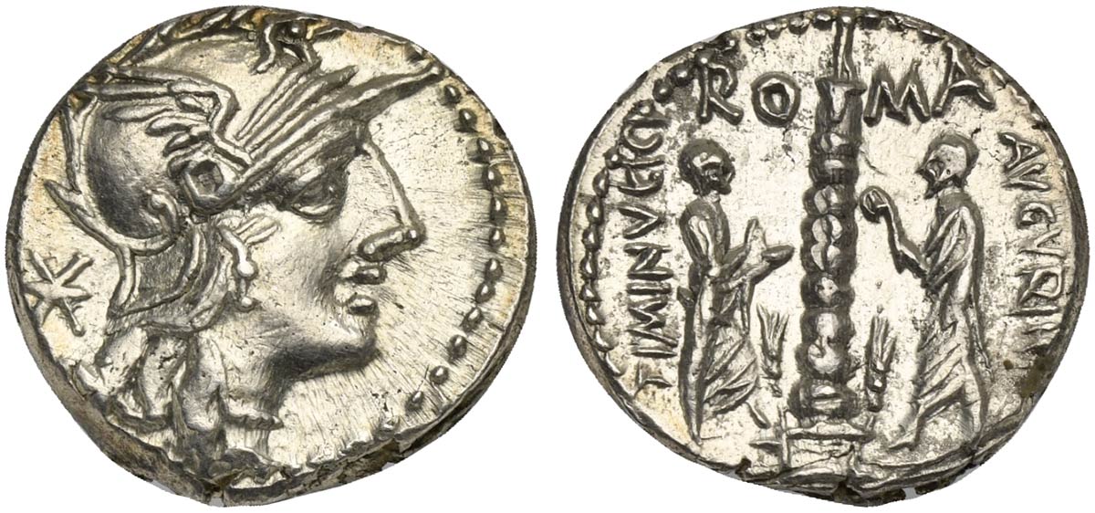 Ti. Minucius C.f. Augurinus, Denarius, Rome, 134 BC; AR (g 3,95; mm 18; h 1); Helmeted head of Roma r.; behind, *, Rv. The Columna Minucia at Porta Trigemina, with spiral shaft surmounted by statue, two large grain ears at base, to r. M. Minucius Faesus, veiled and togate, holding lituus, to l. togate man holding loaves or cakes, resting foot on modius; on l., TI MINVCI C F; on r., AVGVRINI; above, RO - MA. Crawford 243/1; Minucia 9; Sydenham 494.