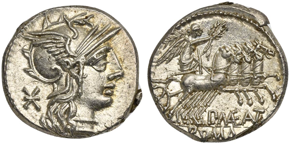 P. Maenius M.f. Antiaticus, Denarius, Rome, 132 BC; AR (g 3,87; mm 19; h 7); Helmeted head of Roma r.; behind, *, Rv. Victory in quadriga r., holding reins, palm-branch and wreath; below, P MAE ANT; in ex. ROMA. Crawford 249/1; Maenia 7; Sydenham 492.
