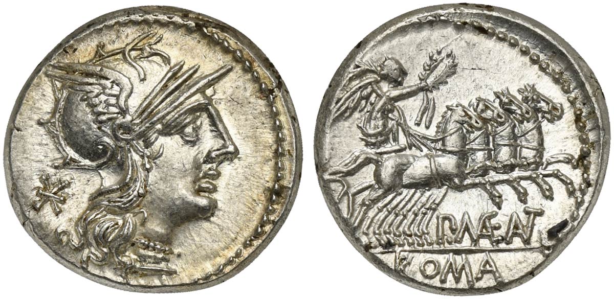 P. Maenius M.f. Antiaticus, Denarius, Rome, 132 BC; AR (g 3,88; mm 19; h 2); Helmeted head of Roma r.; behind, *, Rv. Victory in quadriga r., holding reins, palm-branch and wreath; below, P MAE ANT; in ex. ROMA. Crawford 249/1; Maenia 7; Sydenham 492.