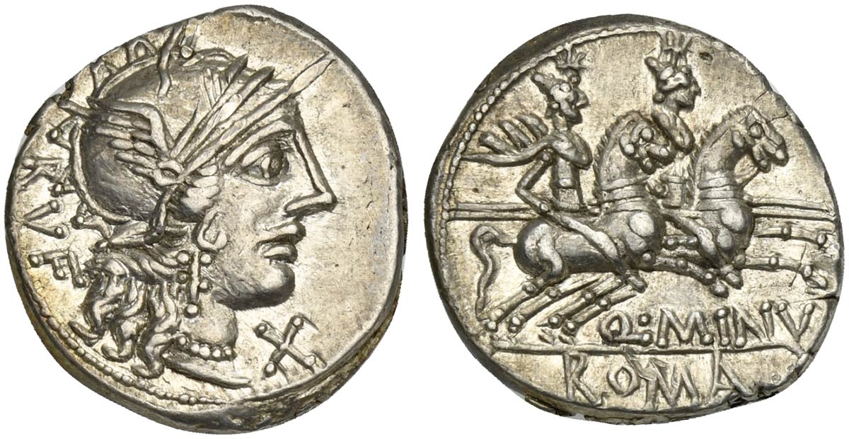 Q. Minucius Rufus, Denarius, Rome, 122 BC; AR (g 3,89; mm 18; h 8); Helmeted head of Roma r.; behind, RVF; before, X, Rv. Dioscuri galloping r.; below, Q MINV; in ex. ROMA. Crawford 277/1; Minucia 1; Sydenham 421.