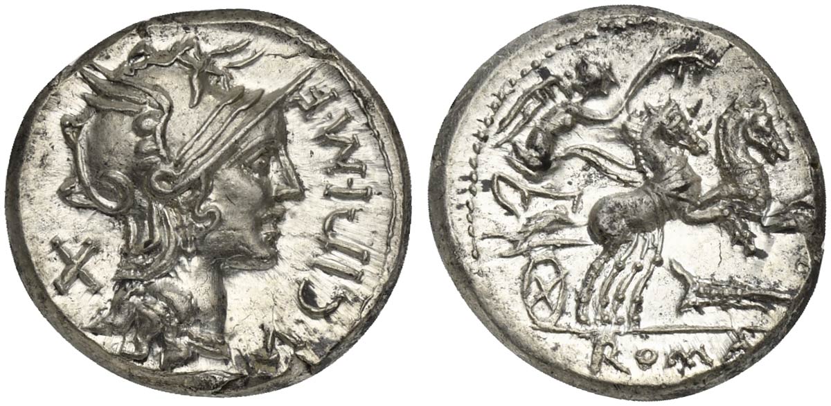 M. Cipius M.f., Denarius, Rome, 115 or 114 BC; AR (g 3,99; mm 17; h 10); Helmeted head of Roma r.; before, M CIPI MF; behind, X, Rv. Victory in biga r., holding reins and palm-branch; below, rudder; in ex. ROMA. Crawford 289/1; Cipia 1; Sydenham 546.