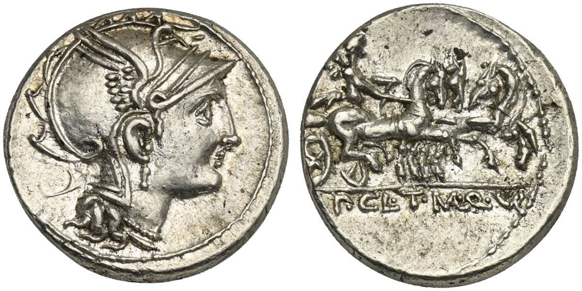 Appius Claudius Pulcher, T. Manlius Mancinus and Q. Urbinius, Denarius, Rome, 111 or 110 BC; AR (g 4,20; mm 17; h 3); Helmeted head of Roma r.; behind, quadrangular device, Rv. Victory in triga r., holding reins; in ex. AP CL T MAL Q VR. Crawford 299/1a; Claudia 2, Mallia 1; Sydenham 570.