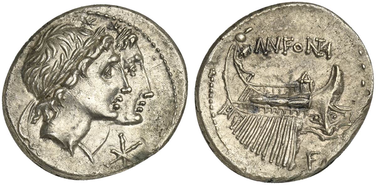 Mn. Fonteius, Denarius, Rome, 108-107 BC; AR (g 3,82; mm 19; h 3); Jugate, laureate, heads of Dioscuri r.; before, X, Rv. Ship r., displaying doliolum in stern; above, MN FONTEI; below, control letter. Crawford 307/1b; Fonteia 7; Sydenham 566.