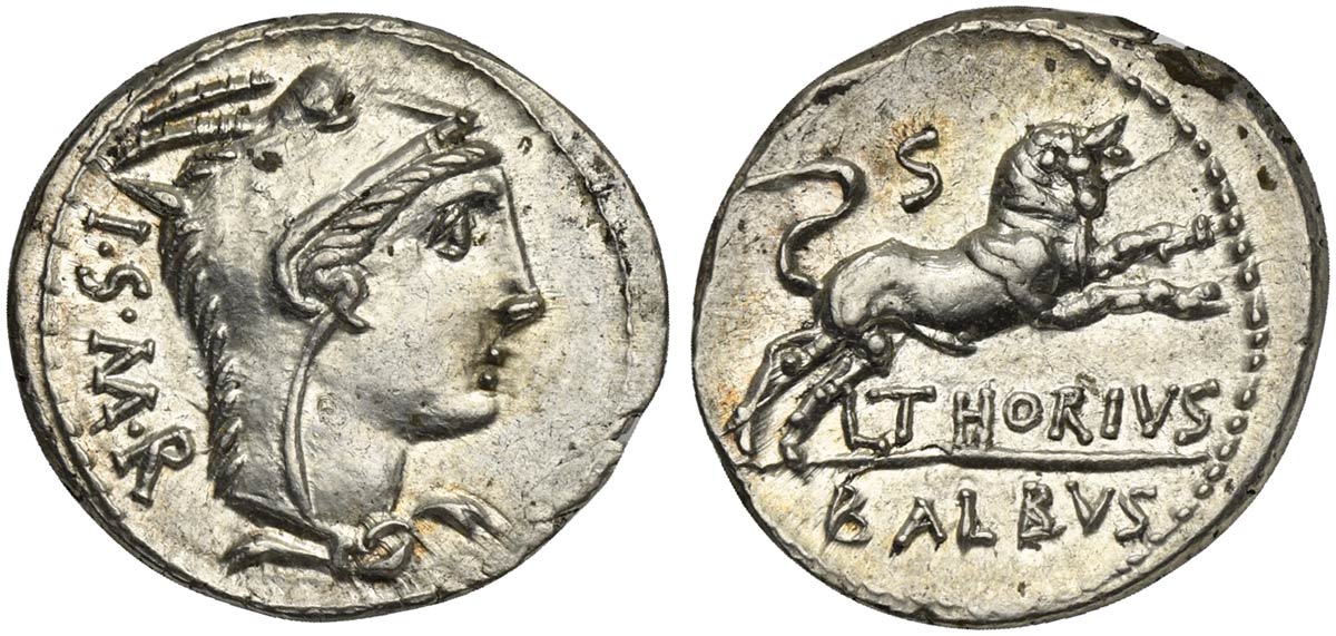 L. Thorius Balbus, Denarius, Rome, 105 BC; AR (g 3,95; mm 20; h 8); Head of Juno Sospita r., wearing goat-skin; behind, I S M R, Rv. Bull charging r.; above, control letter; below, L THORIVS; in ex. BALBVS. Crawford 316/1; Thoria 1; Sydenham 598.