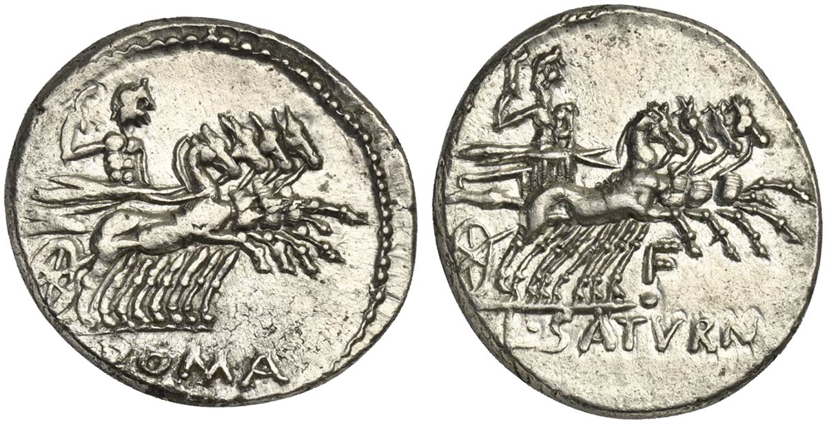 L. Appuleius Saturninus, Denarius, Rome, 104 BC; AR (g 4,00; mm 19; h 9); Saturn in quadriga r., holding reins and harpa; in ex. ROMA, Rv. Saturn in quadriga r., holding reins and harpa; below, control letter; in ex. L SATVRN. Crawford 317/2; Appuleia 3; Sydenham 580.