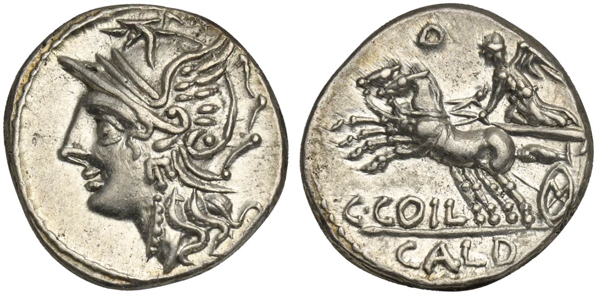 C. Coelius Caldus, Denarius, Rome, 104 BC; AR (g 3,96; mm 17; h 4); Helmeted head of Roma l., Rv. Victory in biga l., holding reins; above, control letter; below, C COIL; in ex. CALD. Crawford 318/1a; Coelia 2; Sydenham 582.