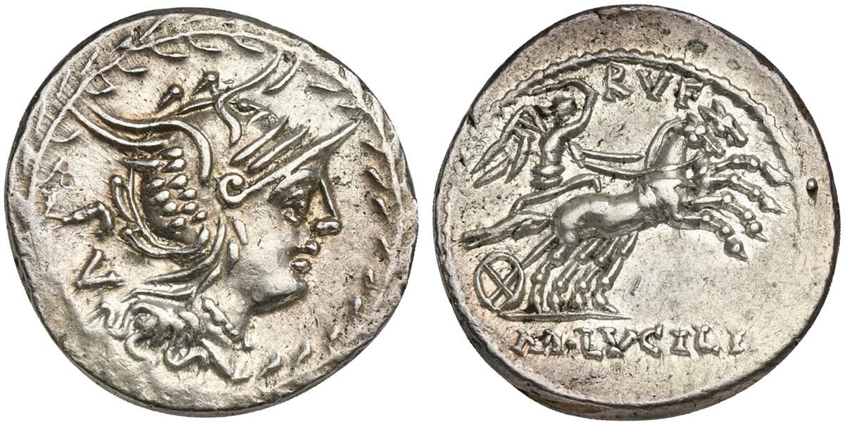 Lot 323 | M. Lucilius Rufus, Denarius, Rome, 101 BC; AR (g 4,00; mm 20; h 2); Helmeted...