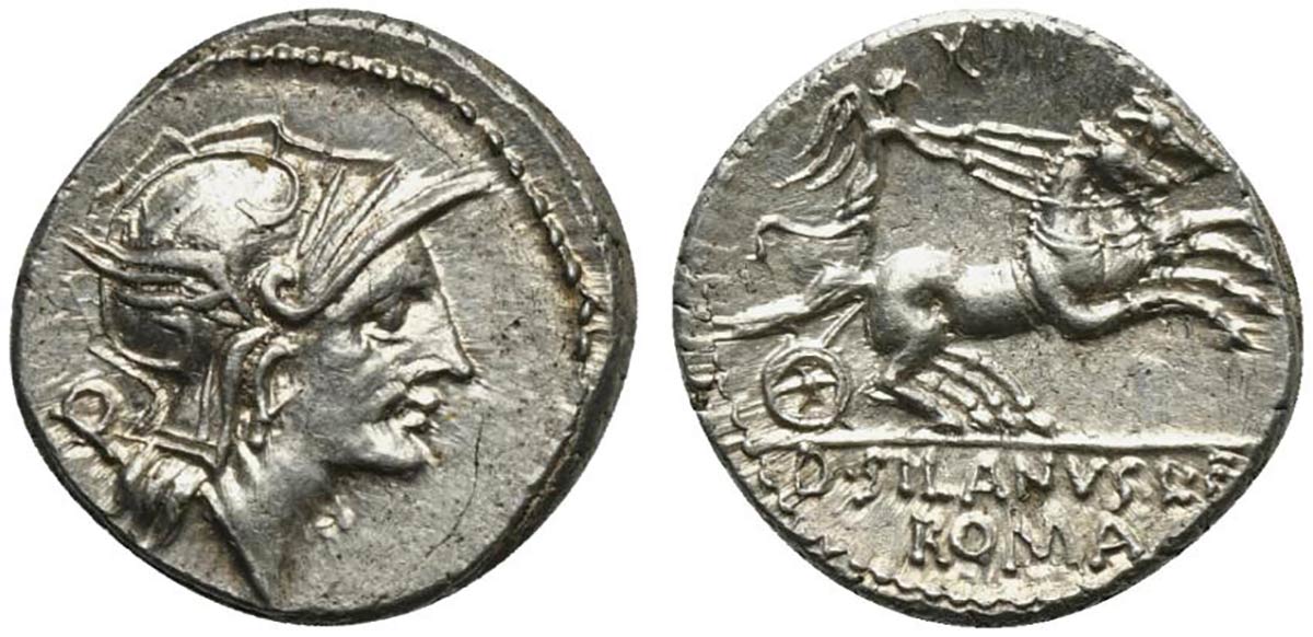 D. Junius Silanus L.f., Denarius, Rome, 91 BC; AR (g 3,89; mm 18; h 1); Helmeted head of Roma r.; behind, control letter, Rv. Victory in biga r., holding reins; above, control numeral; in ex D SILANVS L F / ROMA. Crawford 337/3; Junia 15; Sydenham 646.