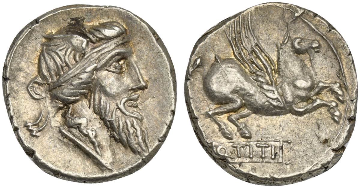 Q. Titius, Denarius, Rome, 90 BC; AR (g 3,97; mm 17; h 12); Bearded head r., wearing winged diadem, Rv. Pegasos r.; below, Q TITI in linear frame. Crawford 341/1; Titia 1; Sydenham 691.