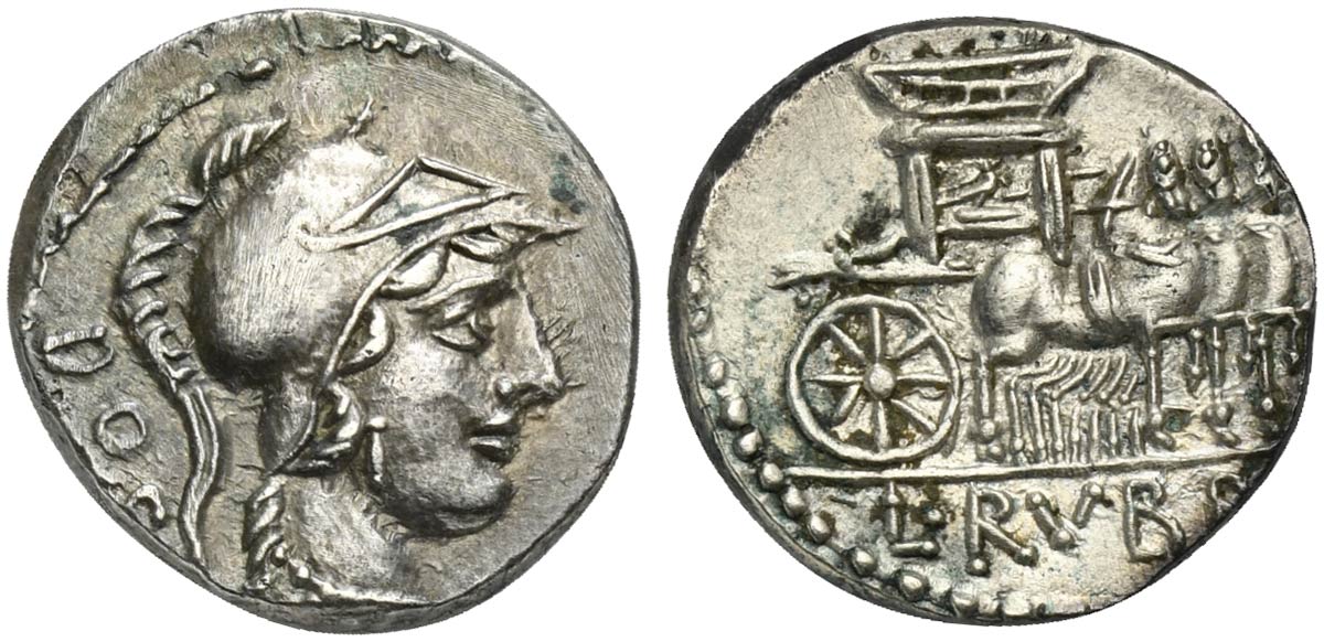 Lot 336 | L. Rubrius Dossenus, Denarius, Rome, 87 BC; AR (g 3,54; mm 16; h 4); Helmeted...