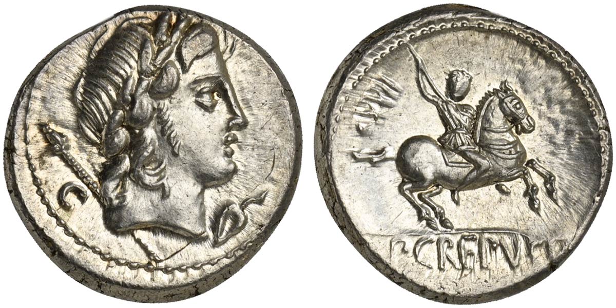 P. Crepusius, Denarius, Rome, 82 BC; AR (g 4,51; mm 17; h 12); Laureate head of Apollo r.; behind, sceptre and control letter; before, control symbol, Rv. Horseman r., brandishing spear; behind, control numeral; in ex. P CREPVSI. Crawford 361/1c; Crepusia 1; Sydenham 738a.