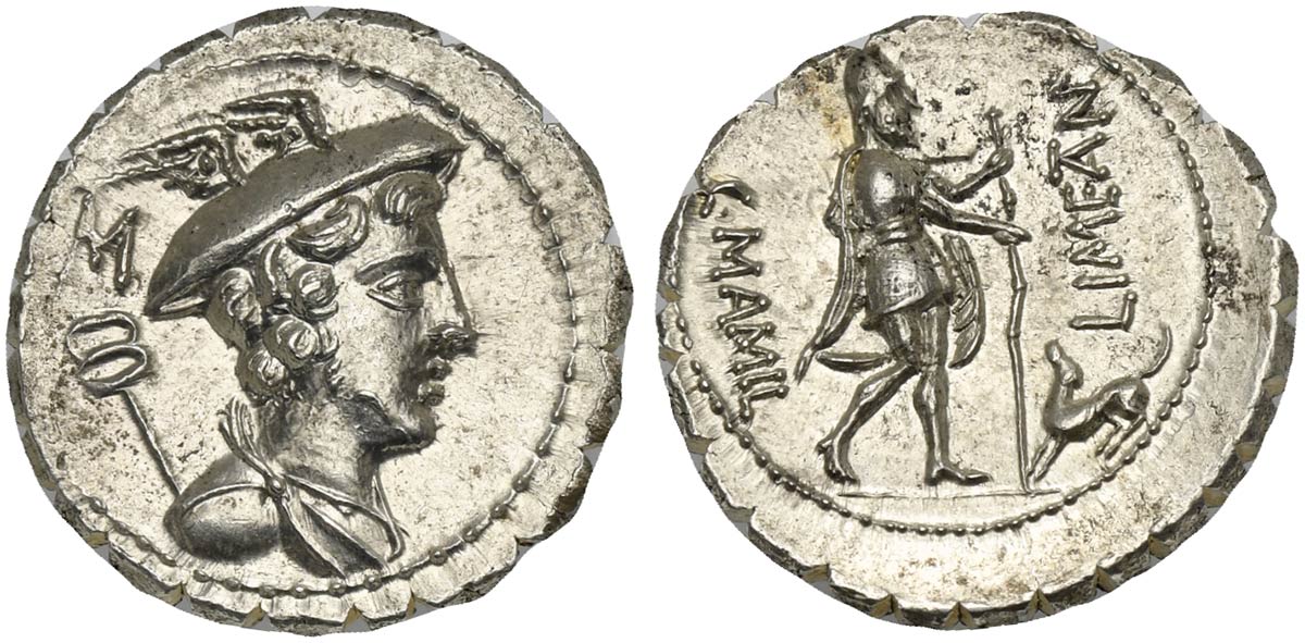 C. Mamilius Limetanus, Denarius Serratus, Rome, 82 BC; AR (g 4,25; mm 19; h 10); Draped bust of Mercury r., wearing winged petasus; behind, caduceus and control letter, Rv. Ulysses standing r., holding staff and extending hand to dog Argus; on l., C MAMIL; on r., LIMETAN. Crawford 362/1; Mamilia 6; Sydenham 741.