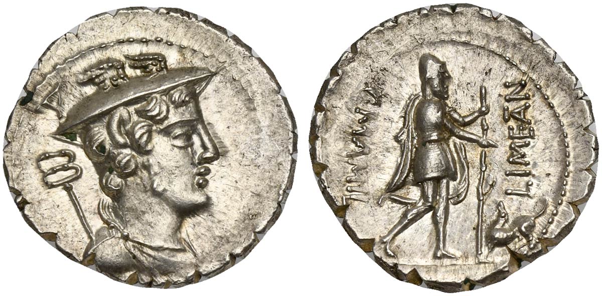 C. Mamilius Limetanus, Denarius Serratus, Rome, 82 BC; AR (g 3,96; mm 19; h 9); Draped bust of Mercury r., wearing winged petasus; behind, caduceus and control letter, Rv. Ulysses standing r., holding staff and extending hand to dog Argus; on l., C MAMIL; on r., LIMETAN. Crawford 362/1; Mamilia 6; Sydenham 741.