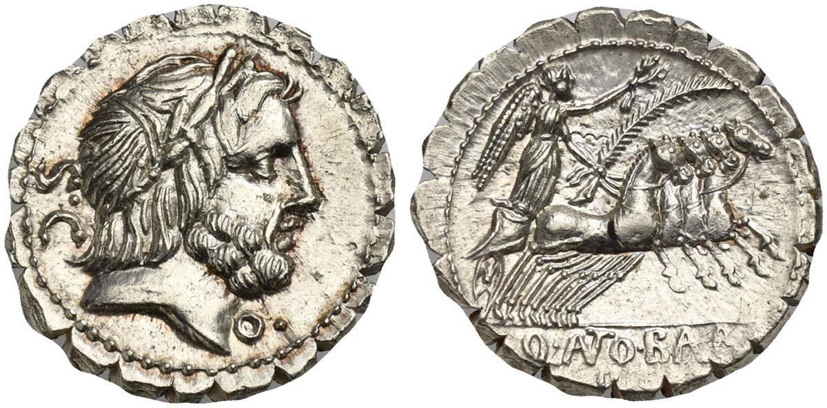 Q. Antonius Balbus, Denarius Serratus, Rome, 83-82 BC; AR (g 3,96; mm 20; h 8); Laureate head of Jupiter r.; behind, S C; below, control mark, Rv. Victory in quadriga r., holding wreath and palm branch; in ex. Q ANTO BALB / PR. Crawford 364/1c; Antonia 1b; Sydenham 742a.