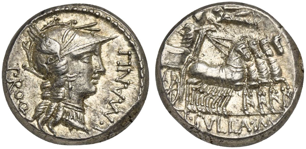 L. Cornelius Sulla Felix and L. Manlius Torquatus, Denarius, Military mint traveling with Sulla, 82 BC; AR (g 4,68; mm 16; h 11); Helmeted head of Roma r.; before, L MANLI; behind, PRO Q, Rv. Triumphator, crowned by flying Victory, in quadriga r., holding reins and caduceus; in ex. L SVLLA IM. Crawford 367/5; Manlia 4, Cornelia 42; Sydenham 757.