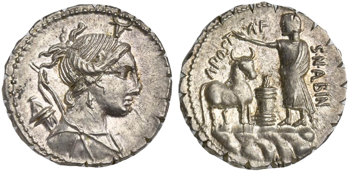 A. Postumius A.f. Sp.n. Albinus, Denarius Serratus, Rome, 81 BC; AR (g 3,90; mm 19; h 8); Draped bust of Diana r., with bow and quiver over shoulder; above, bucranium, Rv. Rock, on which stand lighted altar; on l., bull; on r., togate figure holding aspergillum over bull; around, A POST A F - S N ALBIN. Crawford 372/1; Postumia 7; Sydenham 745.
