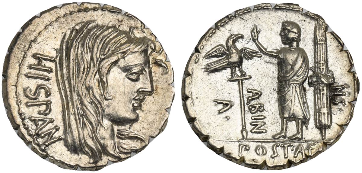 A. Postumius A.f. Sp.n. Albinus, Denarius Serratus, Rome, 81 BC; AR (g 3,48; mm 19; h 6); Veiled head of Hispania r.; behind, HISPAN, Rv. Togate figure with hand raised, standing r. between Aquila and fasces with axe; around, A POST A F S N ALBIN. Crawford 372/2; Postumia 8; Sydenham 746.