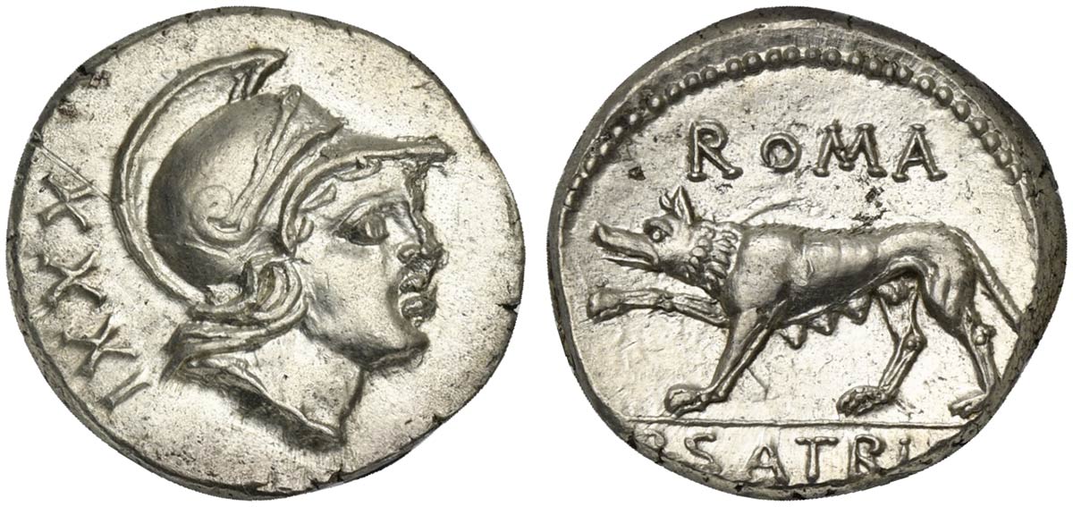 P. Satrienus, Denarius, Rome, 77 BC; AR (g 3,77; mm 17; h 6); Helmeted head of Roma r.; behind, control numeral, Rv. She-wolf l.; above, ROMA; in ex. P SATRIE / NVS. Crawford 388/1b; Satriena 1; Sydenham 781.