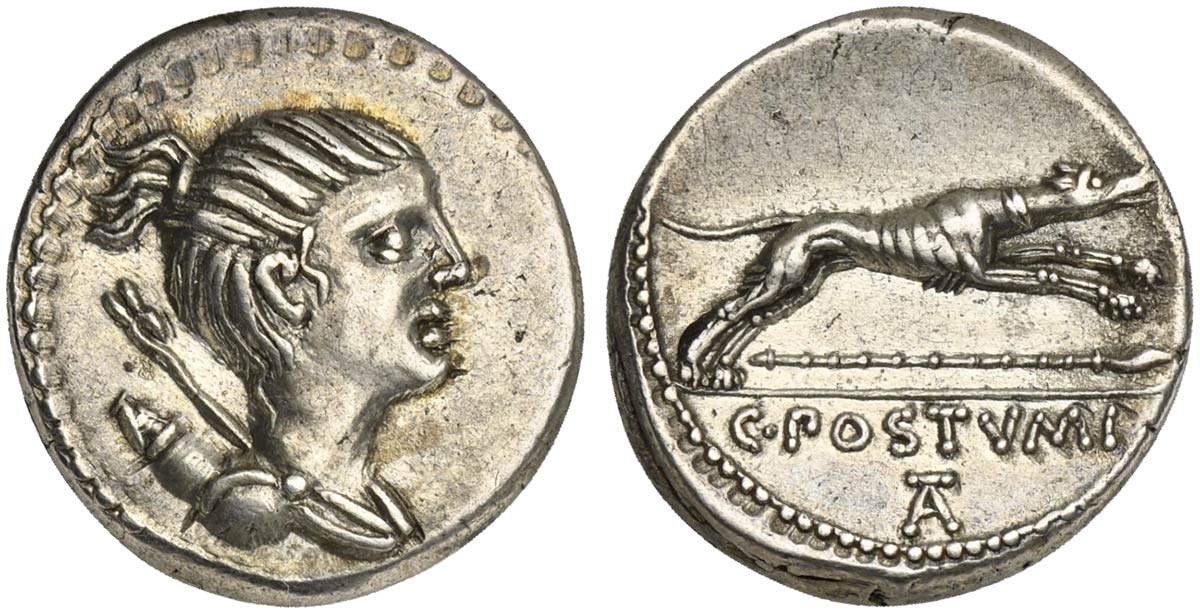 C. Postumius, Denarius, Rome, 74 BC; AR (g 3,86; mm 18; h 6); Draped bust of Diana r., with bow and quiver over shoulder, Rv. Hound running r.; below, spear; in ex. C POSTVMI / AT (or TA). Crawford 394/1a; Postumia 9; Sydenham 785.