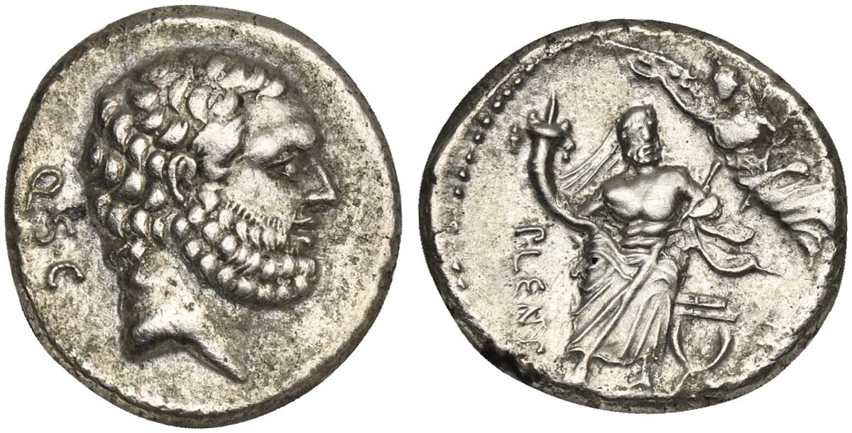 P. Cornelius Lentulus P.f.L.n., Denarius, Rome, 74 BC; AR (g 4,04; mm 17; h 3); Bust of Hercules r.; behind, Q S C, Rv. Genius of the Roman People seated facing, holding cornucopiae and sceptre, being crowned by Victory flying above; on l., P LENT P F; on r., L N. Crawford 397/1; Cornelia 58; Sydenham 791.