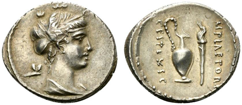 M. Plaetorius M.f. Cestianus, Denarius, Rome, 69 BC; AR (g 3,81; mm 19; h 6); Draped bust of Ceres or Fortuna (?) r., wearing necklace and her hair in net (saccos) and decorated with poppies; on l., control symbol (butterfly), Rv. Capis (jug) and lighted torch; on r., M PLAETORI; on l., CEST EX S C. Crawford 405/4b; Plaetoria 7; Sydenham 803.
