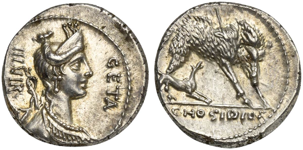 C. Hosidius C.f. Geta, Denarius, Rome, 68 BC; AR (g 4,04; mm 18; h 6); Draped bust of Diana r., with bow and quiver over shoulder; before, GETA; behind, III VIR, Rv. Boar r., wounded by spear and attacked by hound; in ex. C HOSIDI C F. Crawford 407/2; Hosidia 1; Sydenham 903.