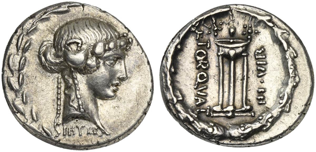 L. Manlius Torquatus, Denarius, Rome, 65 BC; AR (g 3,98; mm 18; h 4); Head of Sibyl r., wearing ivy wreath; below, SIBYLLA; all within laurel wreath, Rv. Tripod, on which stands amphora and two stars; on l., L TORQVAT; on r., III VIR; all within torque. Crawford 411/1a; Manlia 11; Sydenham 836.