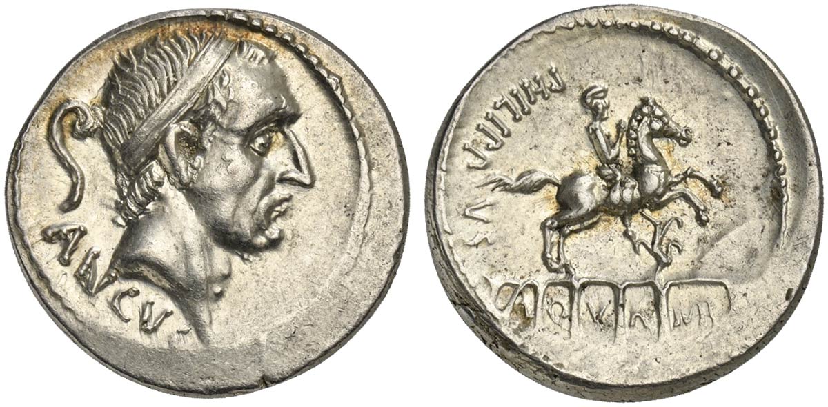 L. Marcius Philippus, Denarius, Rome, 56 BC; AR (g 3,91; mm 19; h 2); Diademed head of Ancus Marcius r.; behind, lituus; below, ANCVS, Rv. Aqueduct, on wich stands equestrian statue with floral support; on l., PHILIPPVS; within arches of aqueduct, AQVA MAR. Crawford 425/1; Marcia 28; Sydenham 919.