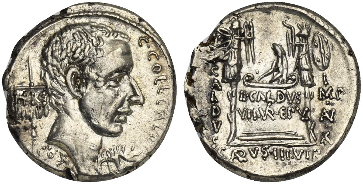 C. Coelius Caldus, Denarius, Rome, 51 BC; AR (g 3,78; mm 18; h 6); Head of C. Coelius Caldus (Cos. 94) r.; before, standard in the form of a boar and C COELIVS CALDVS; below, COS; behind, standard inscribed HIS, Rv. Table inscribed L CALDVS VII VIR EPVL, with figure behind preparing epulum; on l., trophy with Macedonian shield and C CALDVS; on r., trophy with carnyx and oval shield decorated with thunderbolt and IMP AN (ligate) X; below, C CALDVS III VIR. Crawford 437/2a; Coelia 7; Sydenham 894.