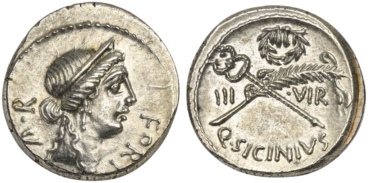 Q. Sicinius, Denarius, Rome, 49 BC; AR (g 3,82; mm 18; h 9); Diademed head of Fortuna Populi Romani r.; before, FORT; behind, P R, Rv. Palm branch tied with fillet and winged caduceus, in saltire; above, wreath; below, Q SICINIVS; in field, III - VIR. Crawford 440/1; Sicinia 5; Sydenham 938.