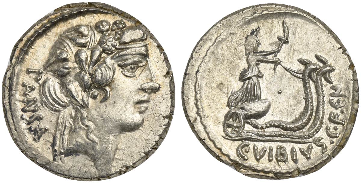 C. Vibius C.f. C.n. Pansa Caetronianus, Denarius, Rome, 48 BC; AR (g 4,08; mm 19; h 8); Head of Liber r., wearing ivy wreath; behind, PANSA, Rv. Ceres in biga of snakes r., holding torch and reins; below, C VIBIVS C F C N. Crawford 449/3a; Vibia 17; Sydenham 945.
